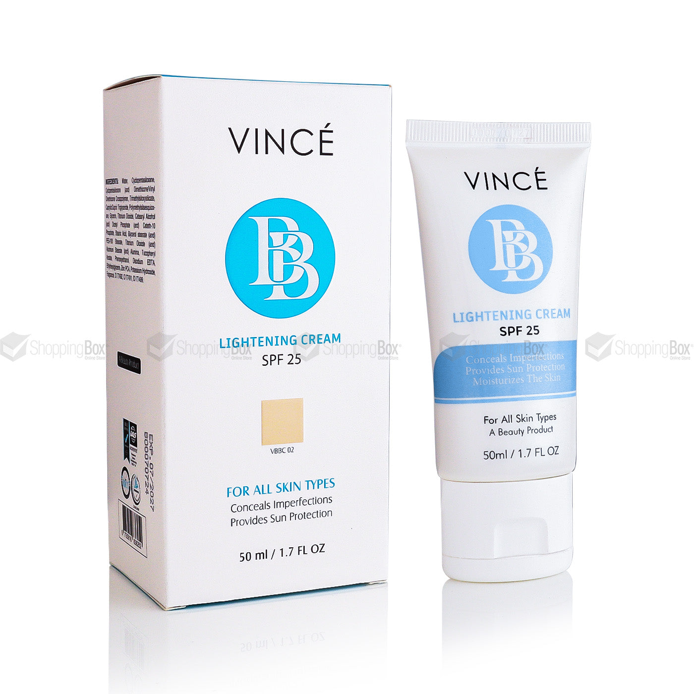 Vince BB Lightening Cream SPF 25 is a lightweight, multi-action cream that evens skin tone, conceals imperfections & provides sun protection. With moisturizing actives, it hydrates skin while leaving a smooth, flawless finish for everyday wear.