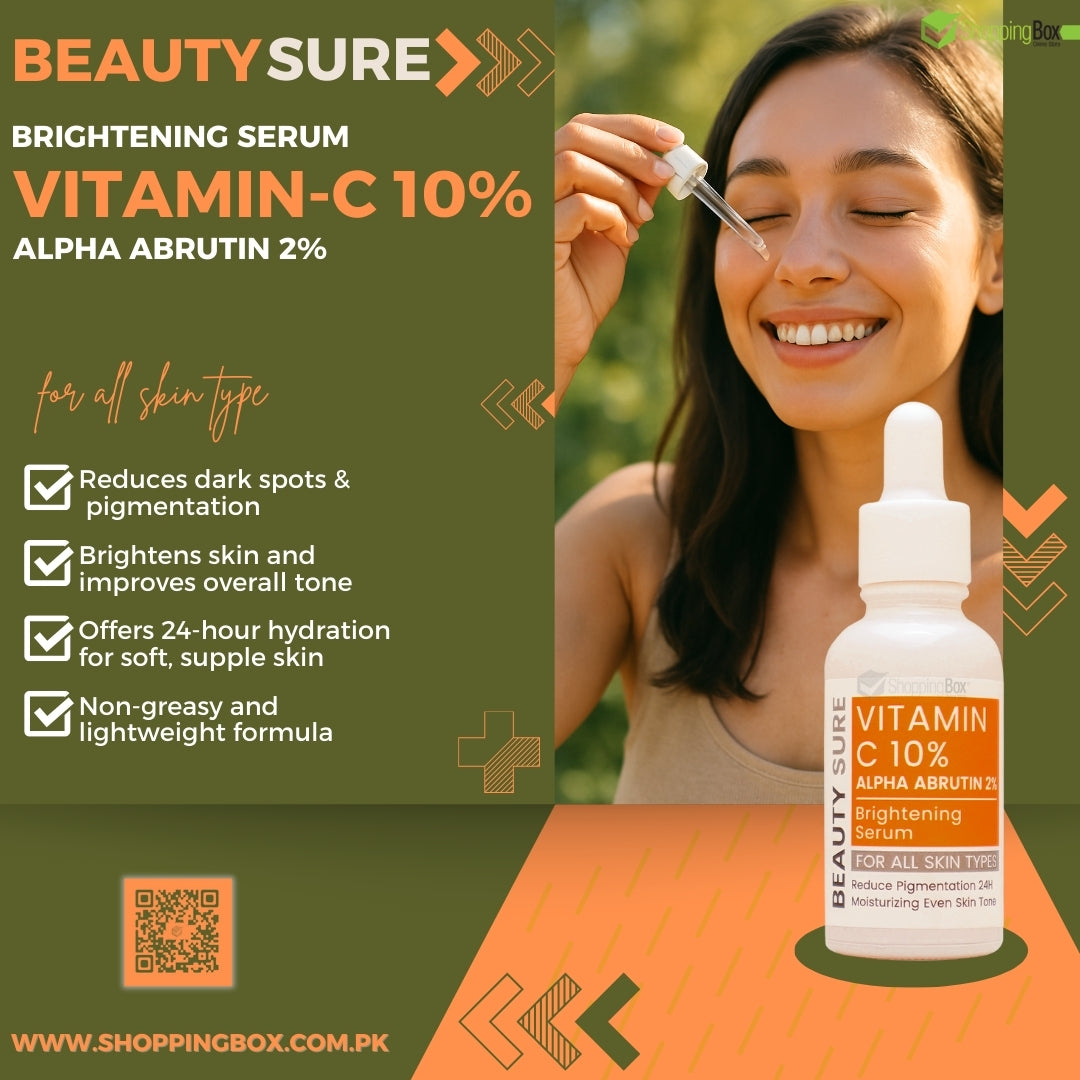 Beauty Sure Vitamin C 10% + Alpha Arbutin 2% Brightening Serum is a powerful antioxidant formula that targets dark spots, uneven tone, and dullness. Enriched with Vitamin C, Alpha Arbutin, and Glycerin, it boosts collagen production, fades pigmentation, and restores radiant, smooth, and even-toned skin. Its non-greasy, lightweight texture absorbs quickly, leaving your skin hydrated and glowing all day.