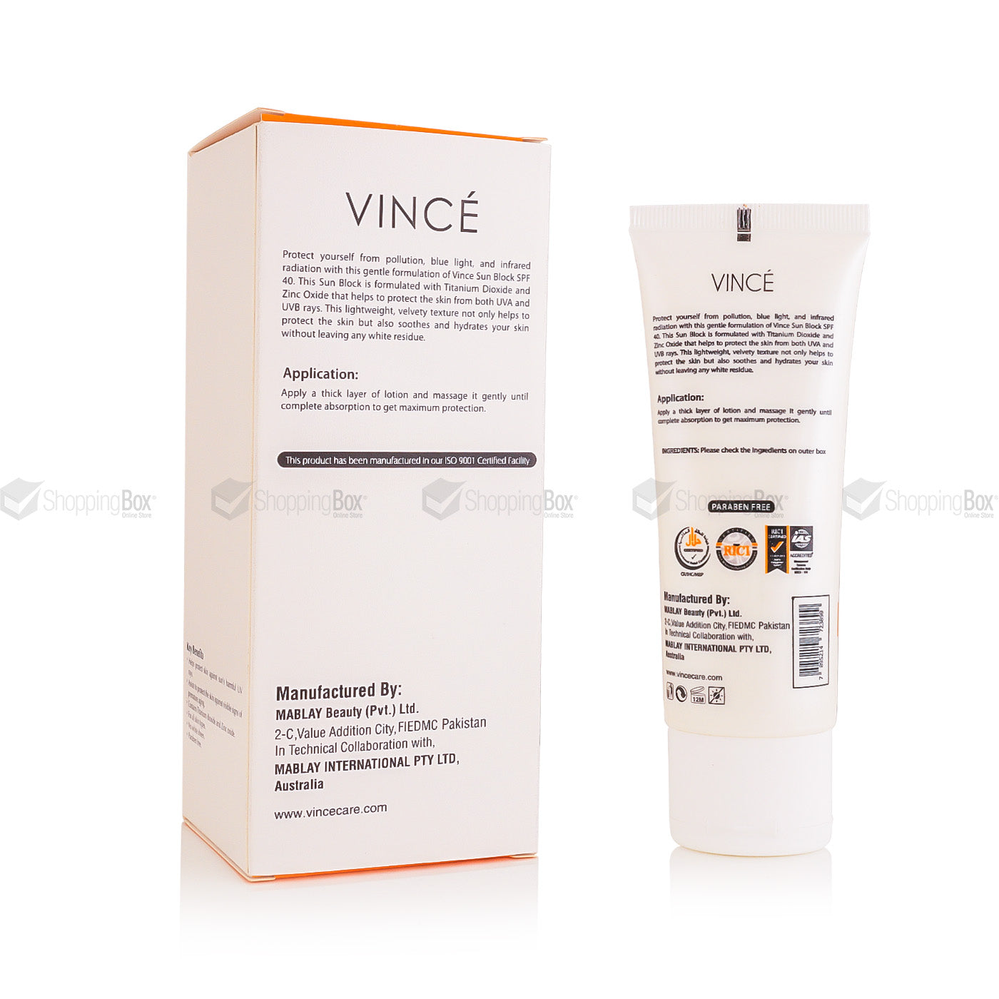 Vince Sun Block SPF 40 is a non-greasy, lightweight formula enriched with Zinc and Titanium Dioxide that provides effective UVA/UVB protection. It shields skin from sun damage, pollution, and blue light while keeping it smooth, hydrated, and shine-free.