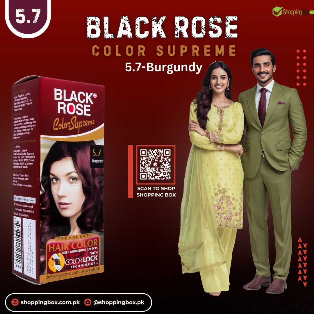 Black Rose Color Supreme 5.7 Burgundy delivers a striking burgundy tone with silky shine. Enriched with Color Lock Technology powered by Coconut Oil, Vitamins & Silicone Conditioner, it deeply nourishes, resists fading, covers 100% greys, and leaves hair vibrant, smooth & glossy for up to 4 weeks.